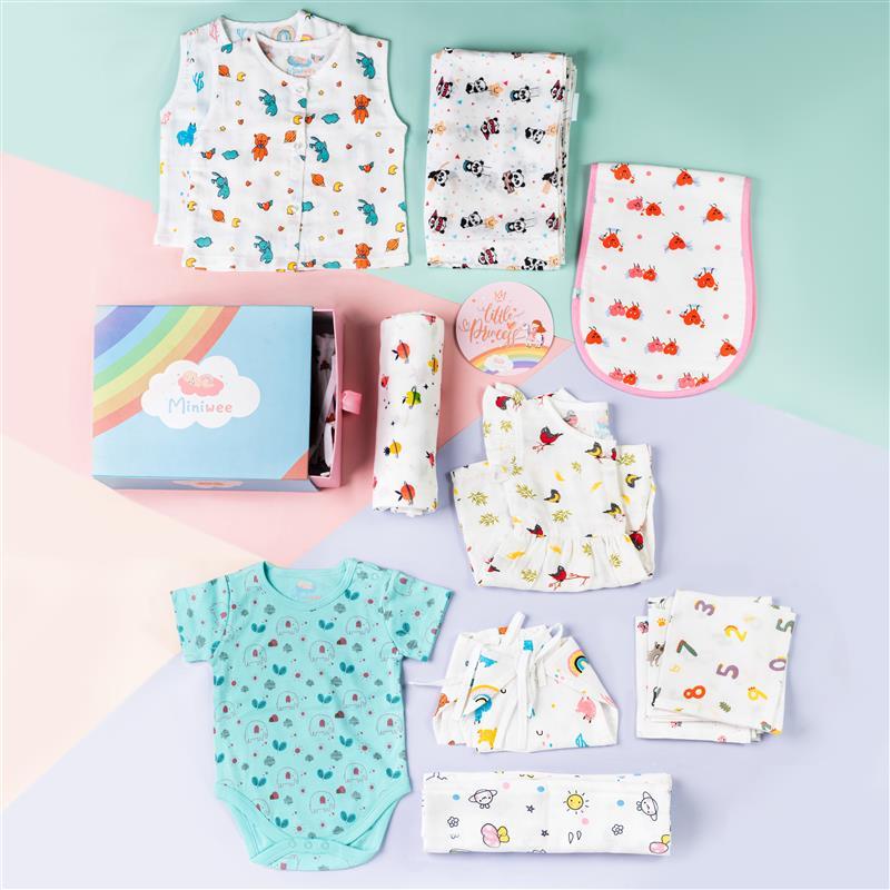 2 jablas, 2nappies, 3 wipes, swaddle , thottil, towel, Body Suit, burp, top and bottom